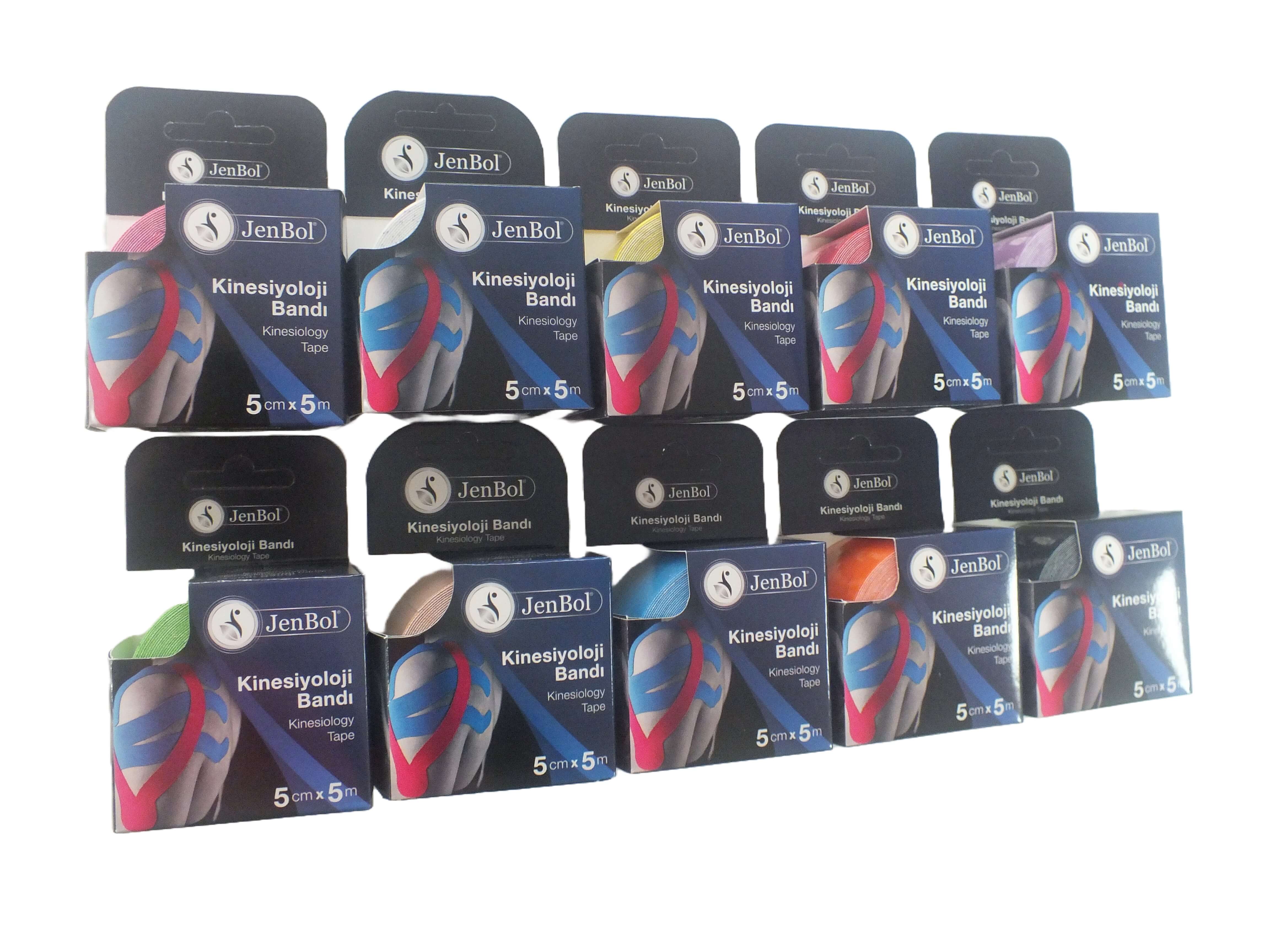 Renk Seçenekleri Jenol kinesiyoloji bandı, farklı renklerdeki kıyafetlere uyum sağlaması için 10 farklı renkte üretilmektedir. Renkler arasında işlevsel bir fark yoktur. Kullanıcı renk beğenisine ve kıyafetine göre arzu ettiği bandı tercih edebilir.